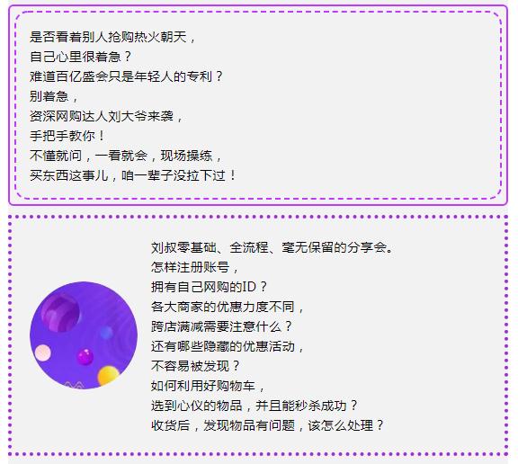 还等什么,赶快加入这个潮流,来听网购达人刘叔的分享会吧!